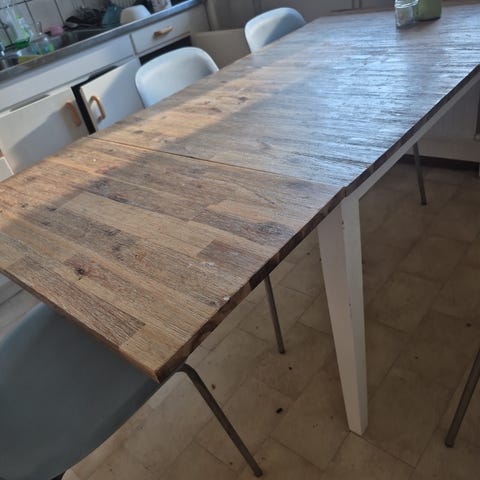 Praktiskt och stabilt matbord i trä med smart utfällbar skiva – perfekt för mindre kök eller lägenhet. Bordet kan enkelt fällas ut för extra plats vid behov.