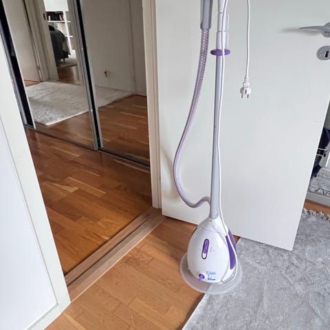 Philips handhållen steamer klädsteamer i svart färg. Produkten är avsedd för att ånga och släta ut kläder och textilier. På bilden syns själva steamern med elkabel, en förvaringspåse samt en värmeskyddande handske. Passar för användning på olika typer av plagg och tyger där man vill minska skrynklor med hjälp av ånga. Nypris 1299. Total användningstid ca 15 minuter.