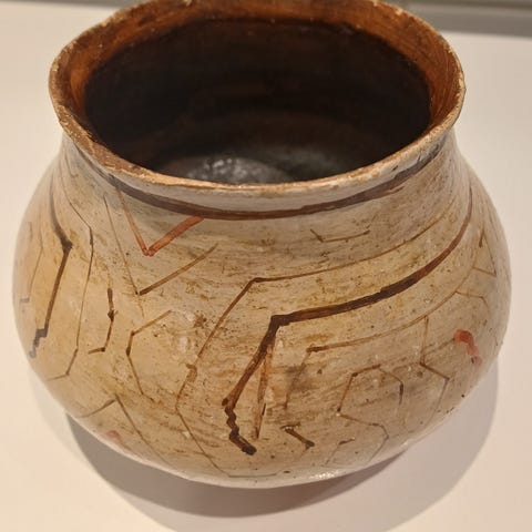 Fungerar bra som en liten vas. I beige nyanser, poröst, förmodligen användes som förvaringskärl.
