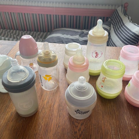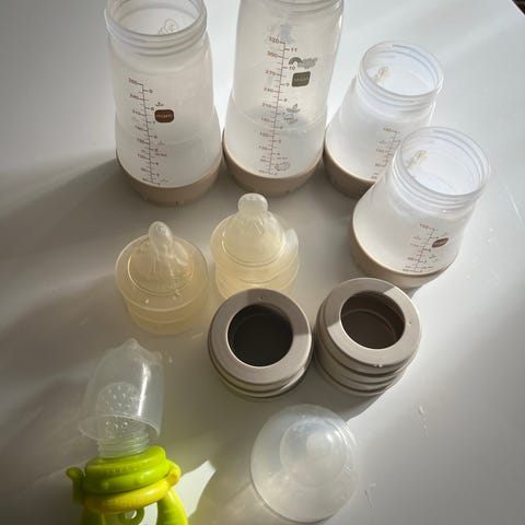 Mam nappflaskor med reservdelar, en av dem är glass nappflaska, i bra skick, reservdelarna är nya, kommer från djur och rökfritt hem, finns i Nacka, kan skickas mot fraktkostnaden.