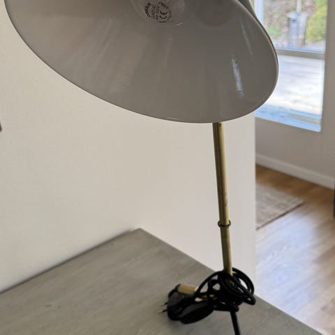 IKEA skrivbordslampa i vit metall. Lampan har rund fot, justerbar arm och skärm som riktar ljuset nedåt. Passar för placering på skrivbord, sidobord eller nattduksbord. Utrustad med sladd och strömbrytare.