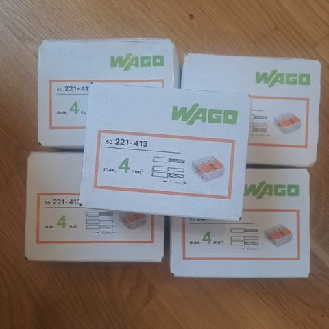 Wago 221-415 kopplingsklämmor. För elinstallationer och kabelanslutningar. Förpackningarna på bilden visar fem kartonger med samma typ av kopplingsklämma. Lämpliga för anslutning av flera ledare i el- och belysningsinstallationer enligt tillverkarens specifikationer på förpackningen. 5 paketer .
