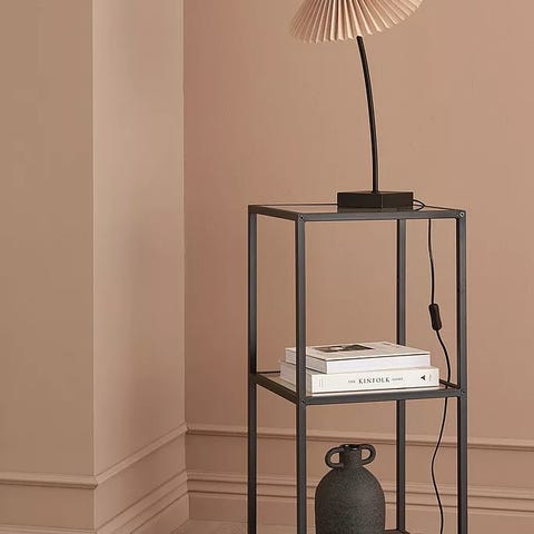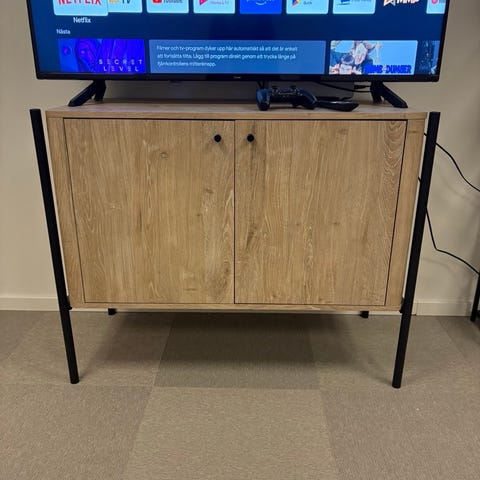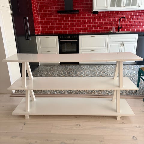 Smidig, lättplacerad hylla med många användningsområden, t.ex. för dekorationer, krukor, böcker eller som tv-bänk. Stomme i pulverlackad metall och två hyllplan i MDF med ekfanér. Det övre hyllplanet är rundat och det undre har raka kanter. Höjd 60,5 cm, bredd 150 cm, djup 30 cm. Höjd mellan hyllplanen 37 cm. Höjd från golvet till första hyllplanet 19,5 cm. Max belastning 20 kg.