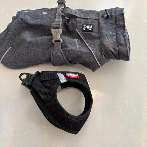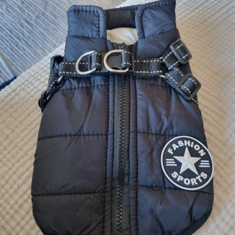 Hundjacka i svart färg med inbyggd sele. Den är endast testad men var i fel storlek. Justerbar nederkant med dragsko. Passar mindre till medelstora hundar, se storlekstabell för rygglängd, hals- och bröstmått på bilden.