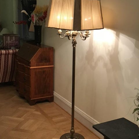 Säljer en trearmad golvlampa i klassisk svensk design från 40/50-talet. Gedigen konstruktion i mässing och trä.