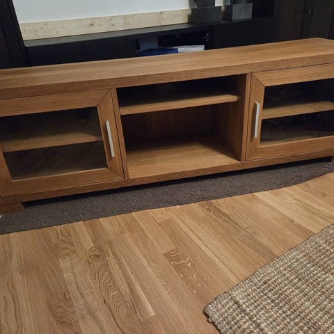 TV-bänk/bokhylla från Tônn (tidigare Betonggruvan) i off-white med lådhurts och skåp. OBS hyllplanen är i massiv furu (säljs inte längre) målade med Ovolin äggoljetempera i färgen Dry Sand - 324.