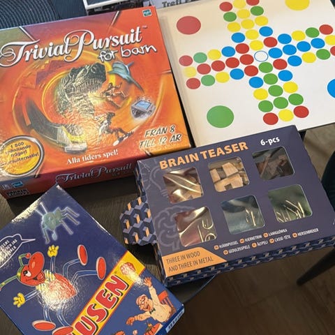 Säljer ett rejält paket med blandade sällskapsspel, perfekt för spelkvällen, festen eller familjemiddagen. Här finns något för alla åldrar – från fartfyllda ordlekar till kluriga frågesporter.