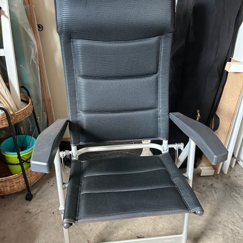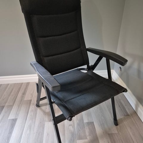 Hopfällbar campingstol med grå klädsel och armstöd. Stolen har hög rygg och lätt stomme i metall, lämplig för användning i trädgård, på camping eller altan. Sits och rygg är klädda i tyg, och stolen kan enkelt fällas ihop för förvaring eller transport. 2 stycken We Camp stolar o dynor.
