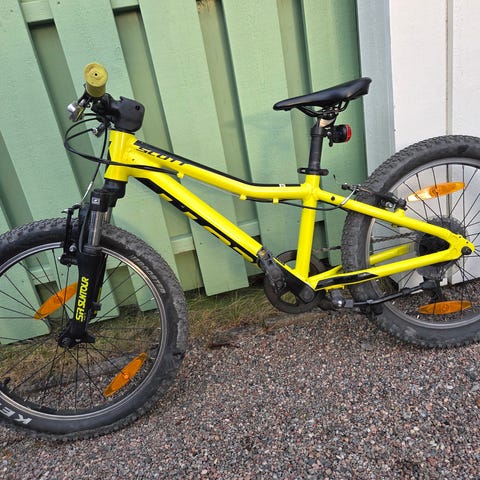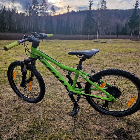 Scott barncykel med 24" hjul i nyskick. Cykeln har utanpåliggande växlar med vridreglage på styret. Utrustad med skivbroms bak och fram, stänkskärmar samt stöd.