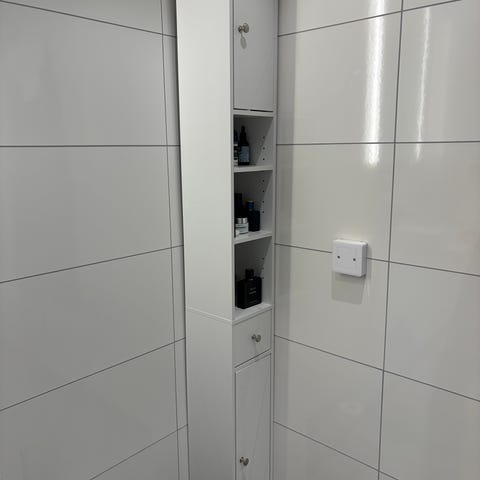 Obs! Hyllplanen lutar lite nedåt eftersom fästet endast sitter på stången. Jag löste det genom att köpa självhäftande hyllstöd på Amazon som man kan se på bilden.