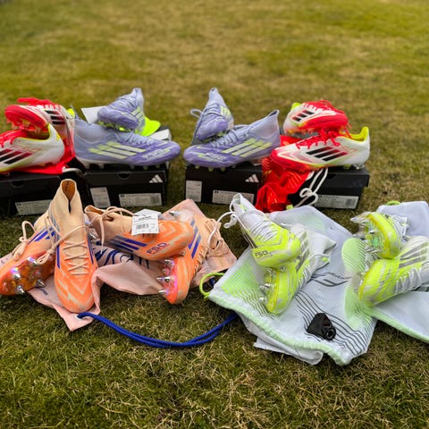 Adidas F50 Elite AG fotbollsskor för spel på konstgräs. Skorna är i färgerna vit och guld med svarta detaljer. Dobbsystemet är anpassat för AG-underlag (artificial grass). På bilderna syns även originalkartong, en vit/lila skopåse med F50-tryck samt ett par lila Adidas-strumpor. Storlek enligt kartong: UK 6,5 / EU-storlek motsvarande 245 mm innermått. Passar för fotbollsspelare som söker lätta skor för konstgräsplaner.