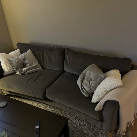 Mycket fin soffa i tyget Diamond Vintage, brett manchestertyg med grå/brun färg. Soffan består av två moduler vilket underlättar flytt och transport. Modulerna fästs enkelt i varandra med metallhakar.