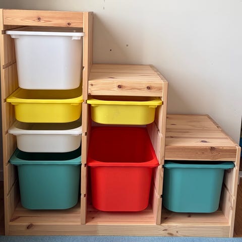 2st IKEA TROFAST förvaringssystem för barn med vit stomme och flera vita plastlådor.