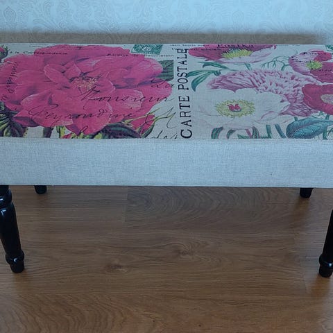 Pall med stoppad sits klädd i blommigt tyg i Josef Frank lintyg Under Ekvatorn. Pallen har fyra ben i trä och en rektangulär, mjukt rundad sits. Passar som extra sittplats, fotpall eller hallmöbel. Stadig och rejäl.
