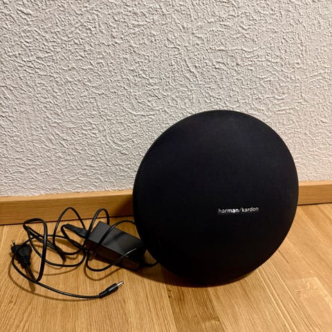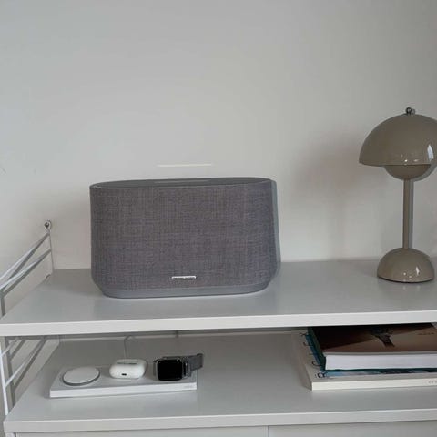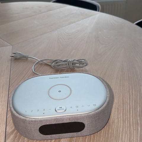 Harman Kardon högtalare i grått tygutförande. Kompakt modell som passar för placering på hylla, fönsterbräda eller bord. Överkant med knappar för styrning av volym och uppspelning. Lämplig för användning i vardagsrum, sovrum eller kök för uppspelning av musik eller annat ljud från kompatibla enheter.