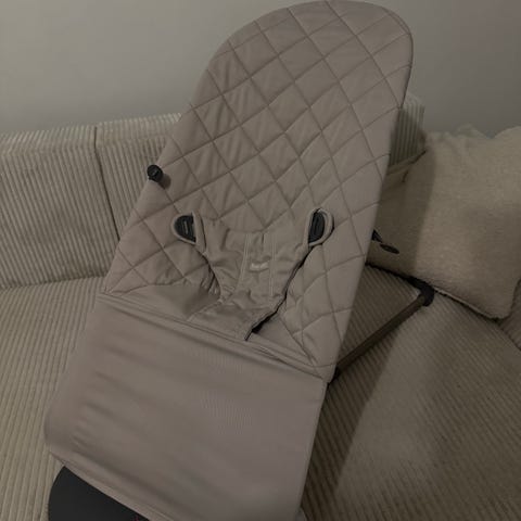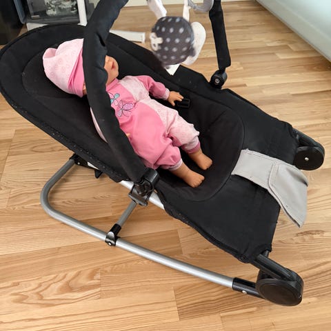 Babysitter i brun färg i meshtyg med tillhörande leksak. Medföljer gör en U-formad amningskudde med mönstrat överdrag samt ett rektangulärt babynest med ljust mönstrat tyg (Morris-mönster). Pris för allt är 1500 kr. Skickas ej.