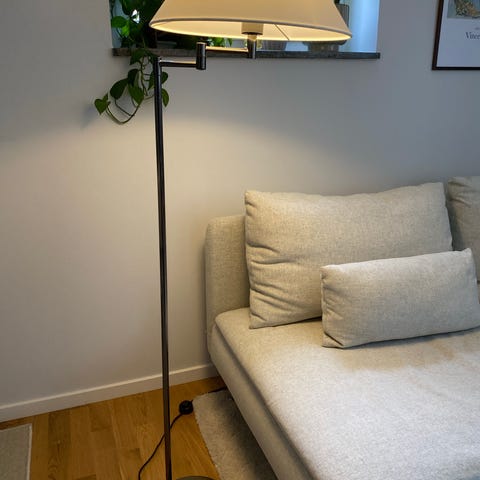 Golvlampa/ läslampa med spotlight och justerbar vinkel och höjd. Tänds enkelt genom att klicka på baksidan av ljuskällan. Hämtas tidigast 1/4 på Södermalm. Säljes pga flytt.