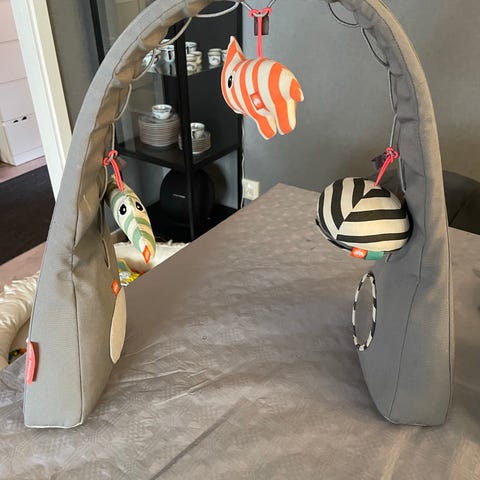 Blå bebisgunga i plast med vita rep. Har legat länge på en vind.