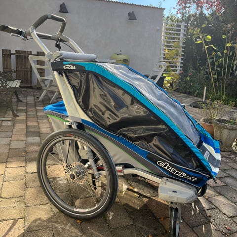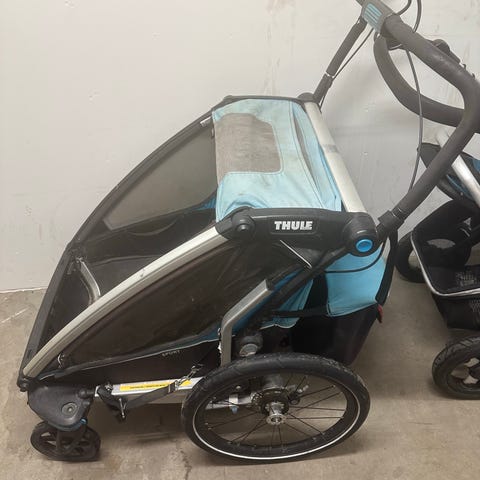 Thule chariot 2 sittplatser. Vagnen har några år på nacken men fungerar som den ska! Rejält lastutrymme bak i vagnen. Ingår löpar set och cykel set.
