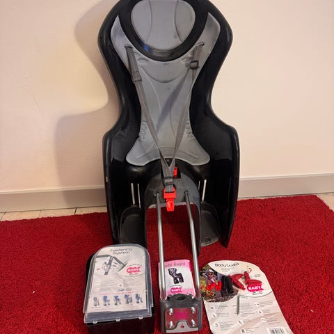 OKbaby barncykelstol i storlek 22. Cykelstolen är i svart och grå plast med metallbyglar för montering på cykelns pakethållare eller ram, beroende på modell. Sätet har ryggstöd och fotstöd samt säkerhetssele för barnet. Passar för transport av barn på cykel enligt tillverkarens rekommendationer för vikt och längd. Monteringsdetaljer syns på bild och ingår enligt vad som visas.