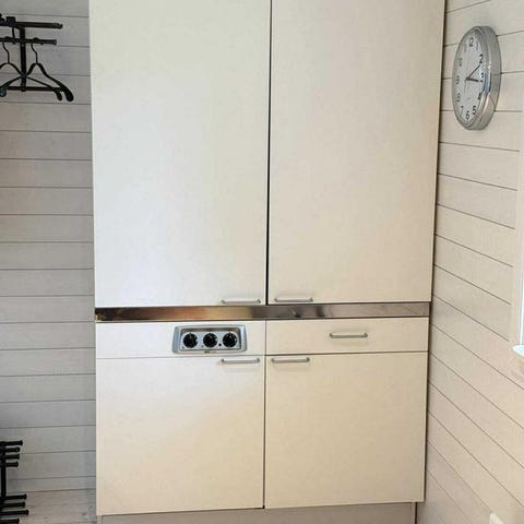 Trinettkök med luckor. Hyllor för porslin mm. spis, vask, kylskåp.