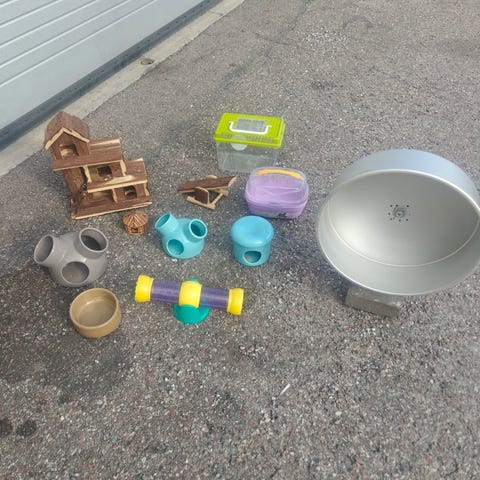 Smådjur burar och tillbehör för hamster eller mindre gnagare. Paketet innehåller två burar i olika storlekar med galleröverdel och plastbotten, flera springhjul, stegar, rörsystem, matskålar, vattenflaskor, hus/kojor samt övriga tillbehör som sandbad och strö. Passar för inomhushållning av smådjur och kan kombineras på olika sätt beroende på behov och utrymme. Skickas ej.
