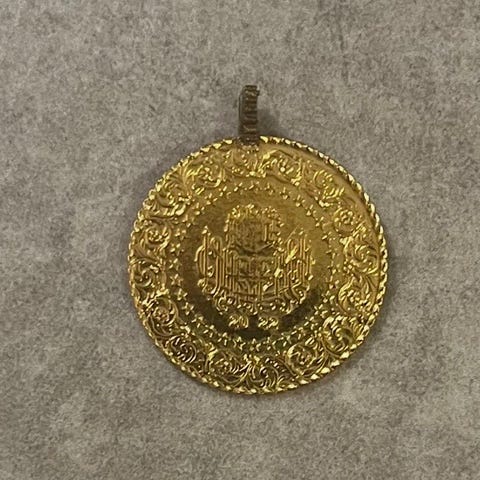 Guldmynt Gustaf V:s regeringstid 1907-1950. Myntet väger 4.75 gram och är stämplad 23k.