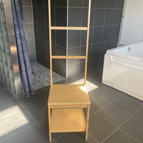 Handdukshängare tillverkad i teak. Tåligt material. Passar i badrum för handdukar. Ställs mot väggen.