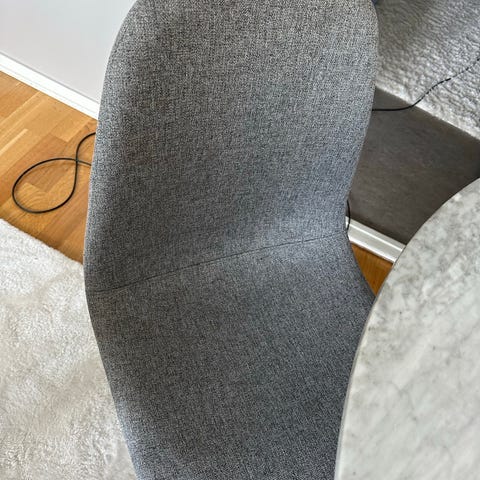 Johanson Design stol med hög rygg i grå textilklädsel. Sits och rygg är helklädda och lätt vadderade för ökad komfort. Stolen har en rund metallfot som ger stabilitet och ett modernt uttryck. Passar som matstol, skrivbordsstol eller som enskild sittplats i vardagsrum, hall eller kontor.