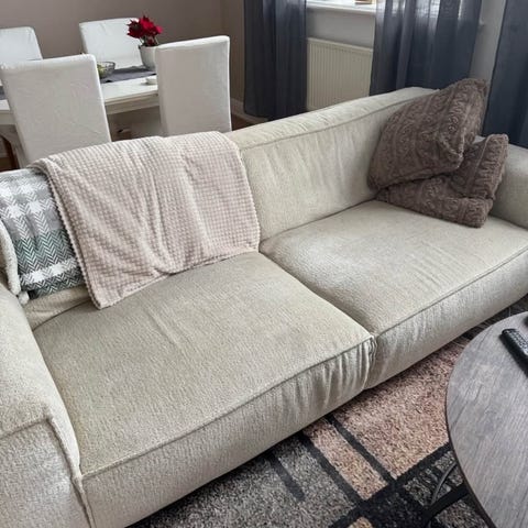 Den kommer i fastklädsel och i färgen Benvit. Kuddarna som är på bild medföljer ej. Det finns originala kuddarna kvar som är oanvända.