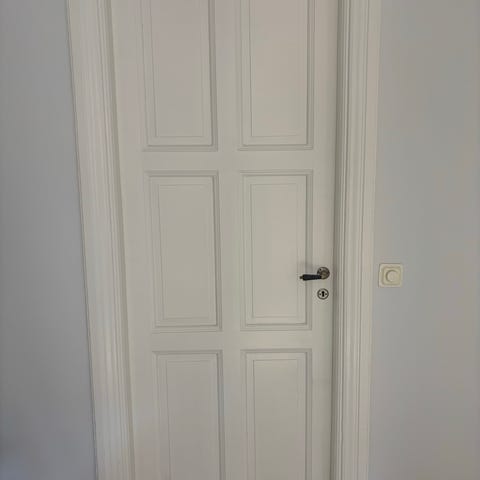 innerdörr i klassisk spegeldesign med tre speglar. Dörren är utrustad med gångjärn, låshus, nyckelskylt och dörrhandtag.