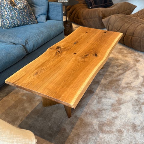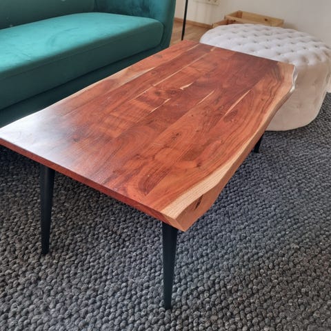Nyproducerat soffbord i massiv 45mm körsbär L120 B57,5 H45cm ben i obehandlat plattstål 10x60mm (8000:-)
