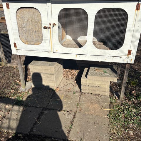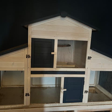 Kaninbur med utegård i svartmålat trä. Huset har upphöjd del med dörr och ventilationsgaller samt två sidosektioner med nätade ytor för utevistelse. Taket är täckt med takpapp. En del av konstruktionen har öppningsbart lock för enklare åtkomst och rengöring.