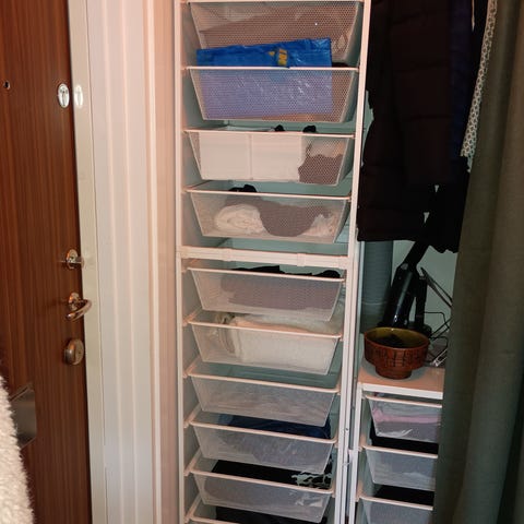 3 av hyllplanen har teleskopiska klädstänger monterat vinkelrätt mod vägg, se bild 3 30cm