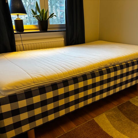 Fast säng. En före detta dubbelsäng som har delats. Mellanmadrassen har därför ett annat överdrag som skydd. Bäddmadrassen är sparsamt använd.