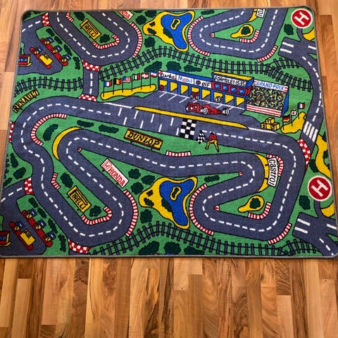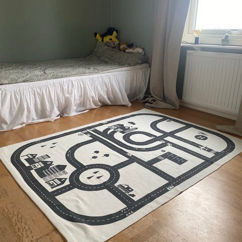 IKEA lekmatta med stadsmotiv. Mattan föreställer vägar, hus och andra detaljer från en stadsmiljö och är avsedd för barnrum eller lekyta. Passar för lek med exempelvis leksaksbilar och figurer. Flerfärgat mönster med tydliga vägbanor och byggnader.