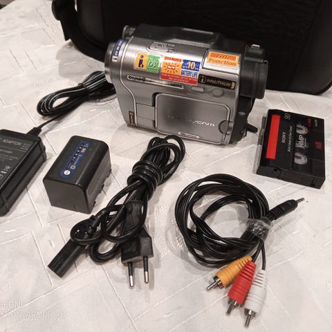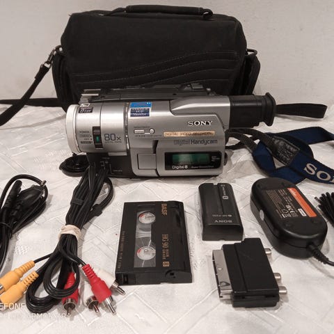 DCR-TRV420E Digital8/hi8/Video8 8mm fint skick, Sparsamt använd, kan också hantera alla typer av 8mm, som hi8 video8, 8mm band, funkar FELFRITT . Denna kamera kan även pelar upp Digital8 (D8) band , jättebra utrustningar för att Digitalisera dina gamla video via DV /firewire/i-Link, har S-Video och AV utgångar också . Det innebär att du kan koppla kamera direkt till dator med hjälp av firewire /dv kabel via DV /FIREWIRE utgång på kamera. Du kan även spela upp på tv. Man kan också föra över video med hjälp av Easycap kabel via AV /RCA utgångar.