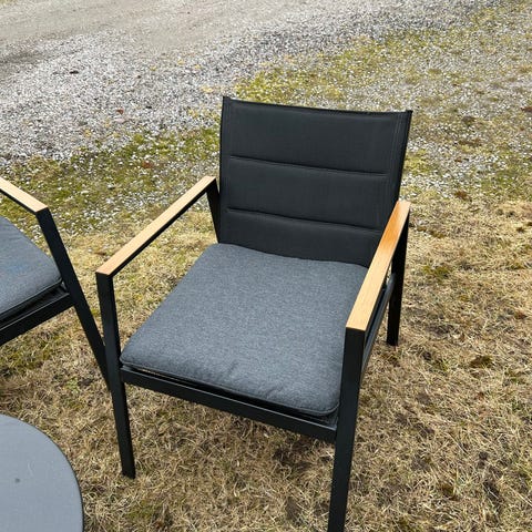 Utemöbelgrupp bestående av en soffa, två fåtöljer och ett soffbord. Möbelstommen är i ljus färg med flätad naturfärgad ram och ljusa sitt- och ryggdynor. Soffbordet har rund skiva och benställning i liknande ljus ton. Passar för uteplats, altan eller trädäck och ger sittplatser för flera personer. Möbelgruppen är avsedd för utomhusbruk.