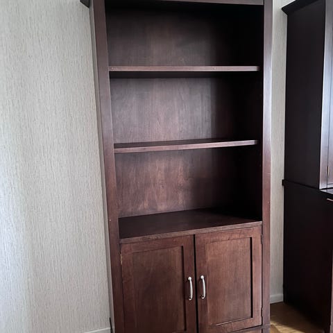 Vitrinen i mörkt trä med en stilren design. Den har en övre del med glasdörrar som gör det möjligt att visa upp innehållet, vilket kan vara porslin, dekorationer eller böcker. Den nedre delen har två dörrar och ett utrymme med två hyllplan, perfekt för tallrikar och muggar. Den har också två lådor, vilket ger extra förvaringsutrymme till exempel till bestick.
