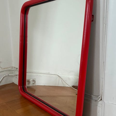 spegel med röd ram. Rektangulär modell som kan användas i hall, sovrum eller vardagsrum. Passar för väggmontering och ger en tydlig helkropps- eller överkroppsreflektion beroende på placering.