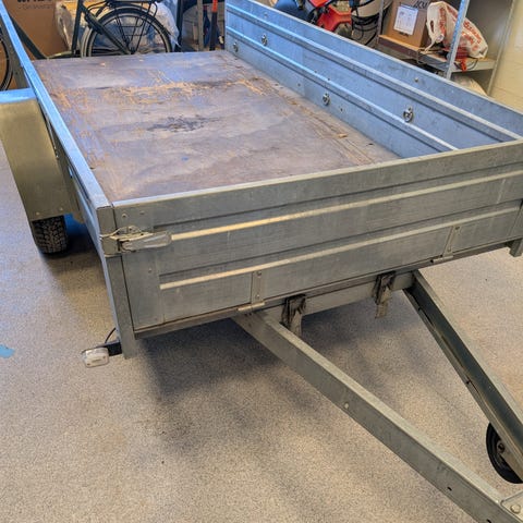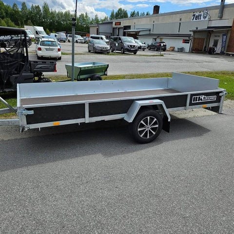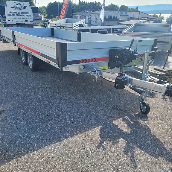 Tot. vikt 750 kg. lastar473 kg. , flakmått 300 x 145 cm , helsvetsad ram , stabil och robust släpvagn, tipp med tipp skruv , alu fälgar. momsad