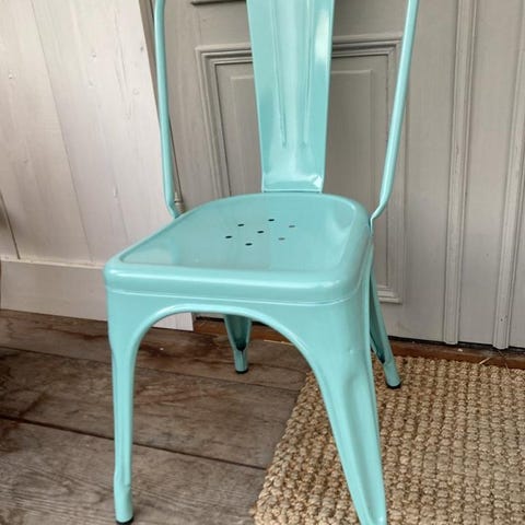 Charmig turkos/grön plåtstol i bra skick men medvetet shabby chic.