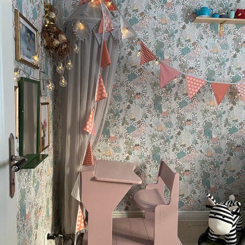 Sänghimmel i senapsgul från Jotex som är öppen både fram och bak, vilket är en fördel om man vill ha en sänglampa på väggen bakom sängen.