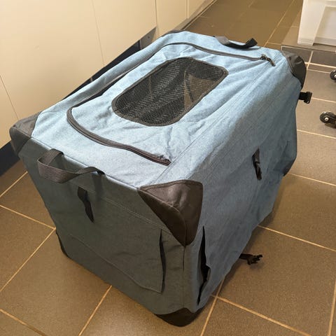 Dogman Milo canvasbur för hund eller annat husdjur. Tillverkad i canvasmaterial med förstärkta hörn och bärhandtag upptill. Mått: längd 70 cm, bredd 52 cm, höjd 52 cm. Färg grön med svarta detaljer. Passar för transport och som viloplats hemma eller på resa.