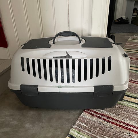 Transportbur för katt eller liten hund i hårdplast. Buren har bärhandtag upptill och justerbar axelrem för enklare transport.