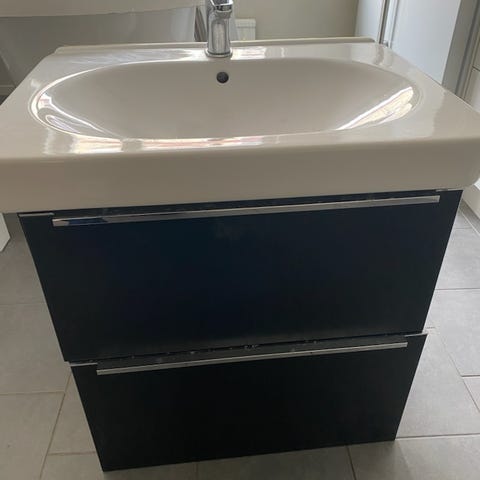 Badrumskommod med integrerat tvättställ i vit färg. Kommoden har två lådor med handtag framtill och är avsedd för montering mot vägg. Tvättstället säljs utan blandare.