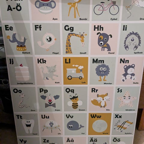 IKEA affisch alfabet tavla med bokstäverna A–Ö i svart och rött på vit bakgrund. Motivet visar hela alfabetet i versaler och lämpar sig för barnrum, lekrum eller andra utrymmen där man vill ha en enkel och tydlig alfabetsposter. Affischen är inramad enligt bild, med glasfront och mörk ram. Passar som väggdekoration och för att öva bokstäver med barn.