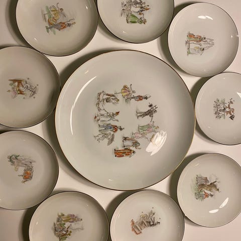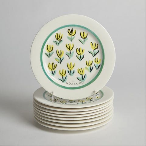 Handmålade tallrikar, 4 st. Design nr 1, 3, 4 och 7. Att användas eller som samlarobjekt. Mönstret "Fish" skapades år 1955 och består av sju olika motiv. I serien finns tallrikar, uppläggningsfat, karotter och såssnipor.