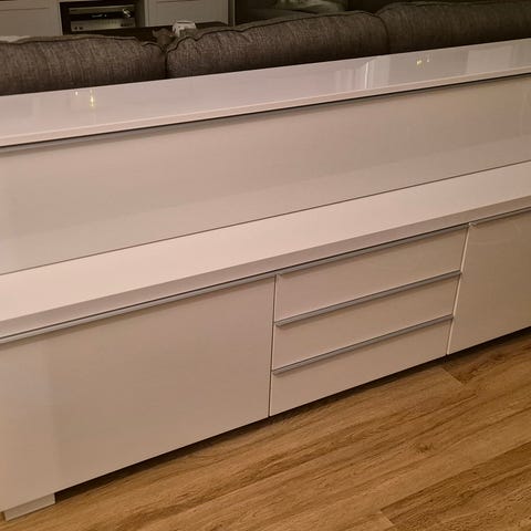 Tre vägghängda Bestå, vita med blanka dörrar,