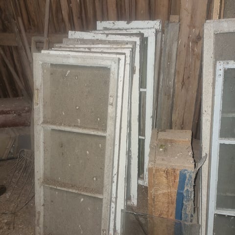 Tre stycken 80-tals fönster som sitter i bågen, utan karm, alltså 6 stycken glasrutor passande växthus eller liknande. Två högerhängda, ett vänsterhängt. Fast spröjs på ytterfönstren. Mått höjd 93, bredd 83 cm . Finns i Björbo 200 kr för alla tre.